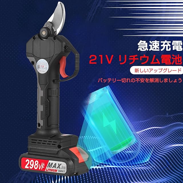 【高速充電と長時間稼働】 アップグレードされた21V充電式リチウム電池(1500mAh)は、電動剪定ハサミの長時間の連続作業をサポートします。プレミアムリチウム充電テクノロジーにより、バッテリーの寿命が向上し、迅速な充電が可能です。