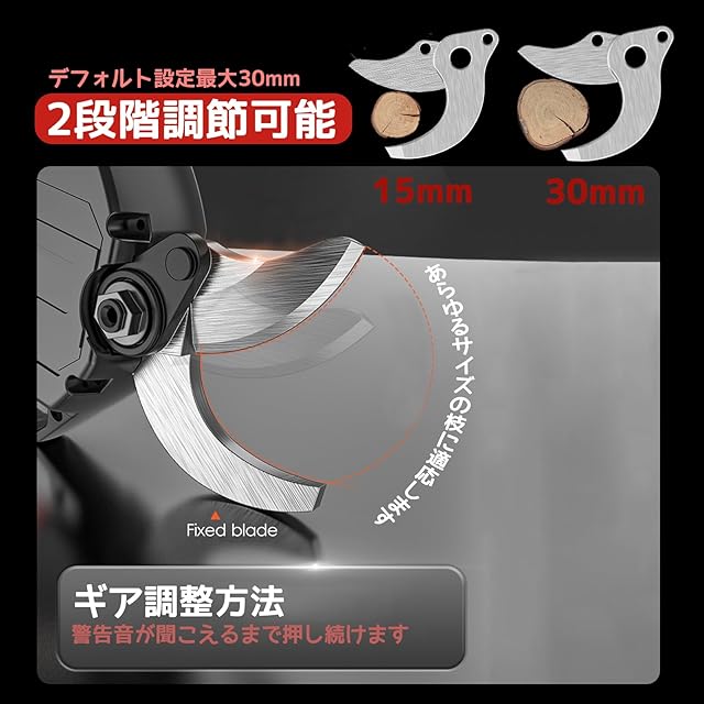 【高品質のSK5特殊鋼刃】 優れた鋭さと耐久性を備えたSK5特殊鋼刃が剪定ハサミ電動に採用されています。最大直径30mmの枝を切断可能で、通常のハサミよりも剪定効率が300%向上します。幹や軽い枝の切断に最適です。