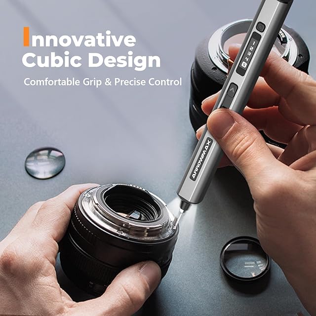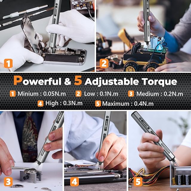 [強力で正確な締め付け] 当社の電動ドライバーセットには、5段階の調整可能なトルク設定と正逆機能があり、電子機器の修理作業のニーズを完全に満たします。手元のあらゆる作業に最適なトルクレベル (0.05~0.4 N.m.、手動: 3 N.m.) を選択してください。低トルク設定を使用すると、繊細な部品を締めすぎから保護し、高トルク設定では確実に締め付けることができます。逆転モードを有効にすると、締め付けと緩めを簡単に切り替えることができます。