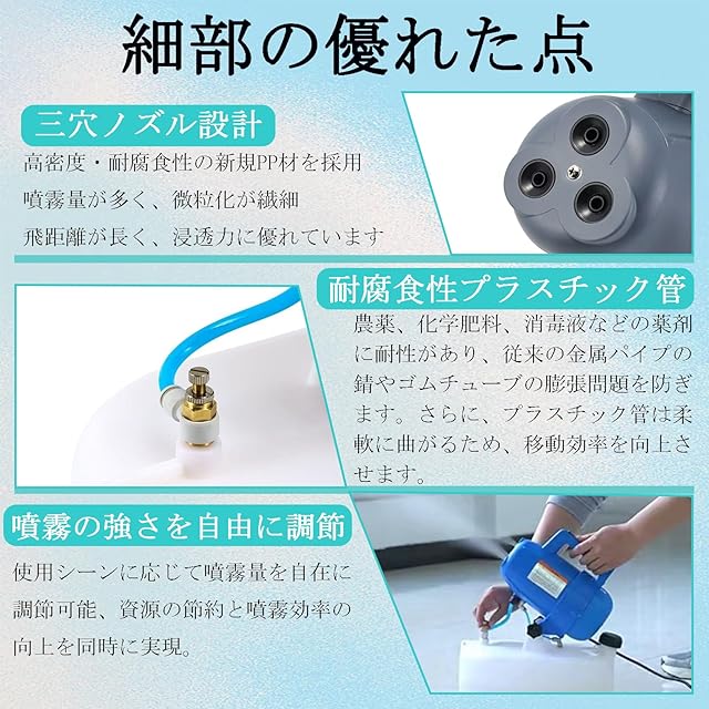 【多機能・マルチシーン対応】:公園/家庭菜園/庭園/農地での水やり・除草に最適。学校/牧場/工場/病院などの殺菌・消毒用途にも対応、家庭用としてホルムアルデヒド除去・加湿などにも活用可能。耐腐蝕性PP素材タンクで、栄養剤/除草剤/肥料など様々な薬剤に対応。生活と作業の頼れる相棒。