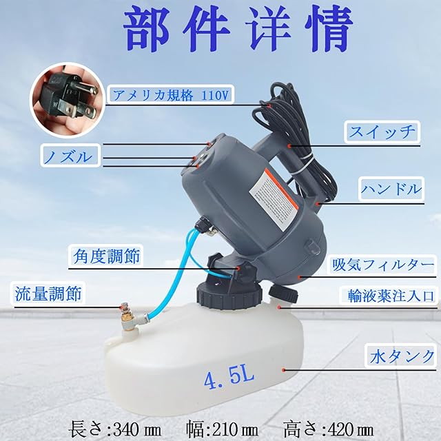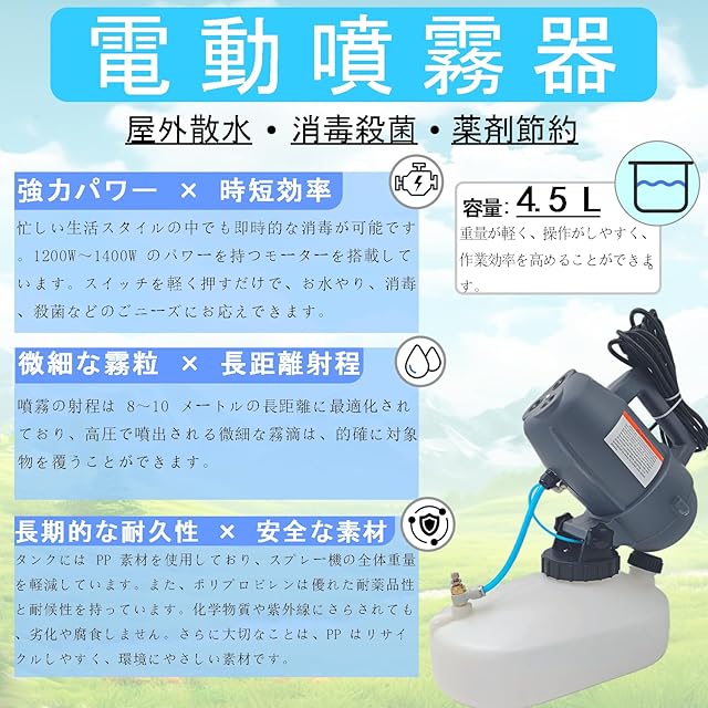 【電動噴霧器製品詳細】タンク容量:4.5L、タンク材質:PP(ポリプロピレン)、定格出力:1200W-1400W、電源コード長さ:5m、噴霧速度:150-260ml/Min、噴射距離:8-10m、液体未充填時重量:3.5kg、付属品:日本語取扱説明書。
