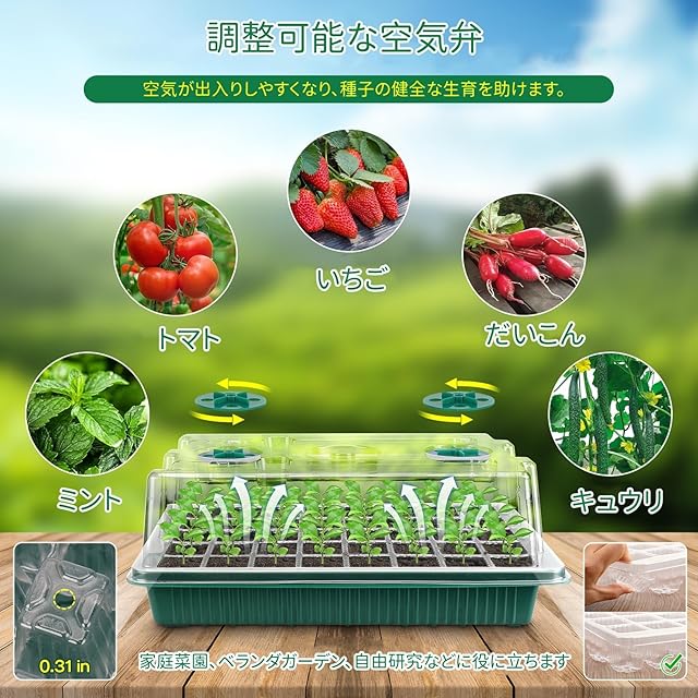 【発芽率の向上】各セルサイズは約4*3.5*5cm、十分な間隔のセルは、混雑を防ぎ、少ないスペースでより多くの苗を可能にします。蓋付きのこのシードトレイの調整可能な通気口により、苗の環境の温度と湿度を調整し、蒸発を減らし、発芽プロセスを制御し、苗の生存率を向上させることができます。