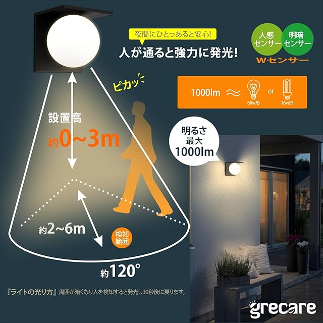 【高感度人感センサー】ソーラー式人感センサー 玄関灯は、暗闇や夜間において6メートル以内に動きを検知すると自動的に点灯し、防犯ライトとして安心安全な照明を保証します。