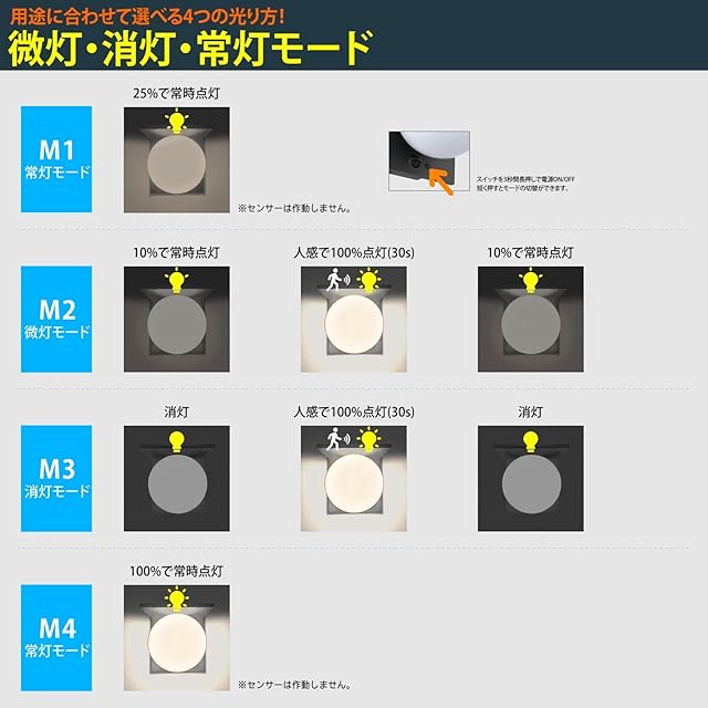【4つの選べる点灯モード】●微灯モード:動きを検知すると自動的に100%点灯に切り替わり、10秒間動きが検知されないと弱輝度(10%)に戻ります。●消灯モード:動きを検知すると自動的に100%点灯に切り替わり、10秒間動きが検知されなければ消灯に戻ります。●常灯モード:25%の明るさまたは100%の明るさで夜明けまで点灯します。
