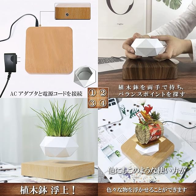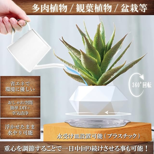 【 おしゃれな空間を演出 】 植木鉢は、清潔感漂うシンプルなホワイト。土台は、オシャレな木目調。家やオフィスに置くだけで、モダンインテリアを演出。また、重心を調整することで、一日中回り続けさせることも可能。