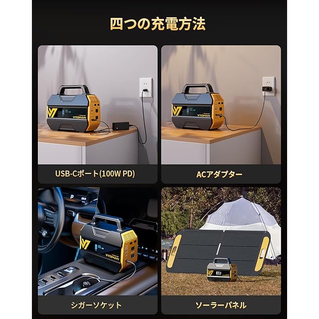 【4Way充電方法・PD100W入出力】ACアダプター、シガーソケット、ソーラーパネル、PD100Wポートを使用して、どこでも簡単に充電可能。MPPTコントローラー機能搭載のソーラーパネルでエネルギー変換効率も抜群です。電気代の節約だけでなく、持続可能なエネルギーを提供します。Type-C規格のPD100Wの双方向充電に対応し、パソコンやその他のデバイスに対して超高速で充電できます。特にビジネスマンにとって、車内に常備しておけば、移動中や外出先でも迅速に充電が可能。※ソーラー充電の効率は日照条件によって変わります。