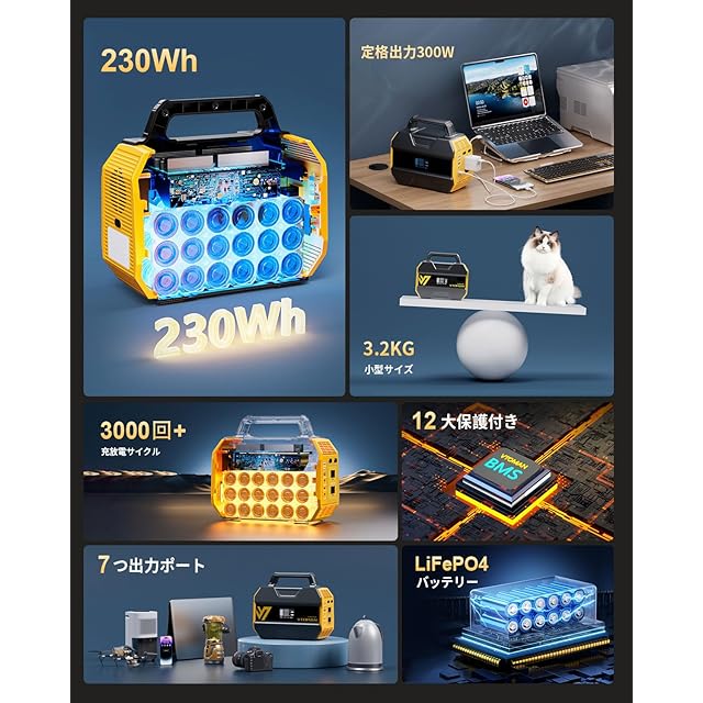 【LiFePO4電池・230Wh大容量】 230Whの大容量バッテリーを搭載し、磷酸鉄リチウムバッテリーを使用することで、充放電回数は3000回と長寿命。一般的なバッテリーより6倍長持ちし、230Wh大容量で、14回のスマホ充電が可能。災害時の通信や緊急電力供給に最適です。毎日1回充電しても、なんと10年以上の使用が可能です。環境にも配慮したグリーンエネルギーで、空気の保護にも貢献。キャンプ、車中泊、旅行、野外撮影、家庭内の停電対策向上に、長時間アウトドア活動に、最適です。