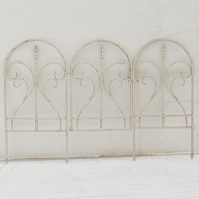 アイアンオーバルフェンス フィニアルにゲート用のパーツをセットしました。ベース・門扉・門扉用パネルのセットとなります。かわいいゲート付きのフェンスが簡単にできちゃいます。土に挿すだけのかんたん設置。連結部分は可動するので、自由な形にアレンジが可能です。カラーは古びたサビ風に汚したアンティークホワイト。フェンスの延長は別売りのベース(SS-IPN-7029F-WHT)をお求めください。