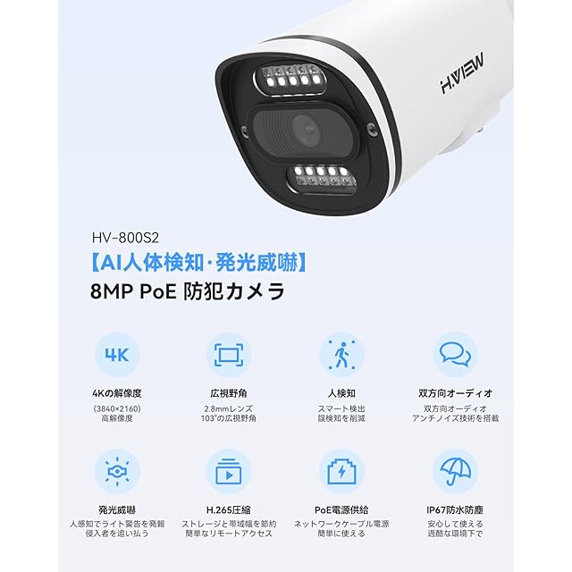 【4K画質・発光威嚇・双方向音声】H.View 800万画素 防犯カメラ 8台セット 有線 屋外 8MP PoE給電式 防犯カメラ 家庭用 マイク内蔵 スピーカー搭載 投光威嚇 8ch H.265 4Kレコーダー 8台まで増設可 監視カメラセット poeカメラ IP67防水防塵 見守りカメラ 電源工事不要 簡単設置 スマホ/パソコン遠隔監視 プラグアンドプレイ(4TB HDD付き)