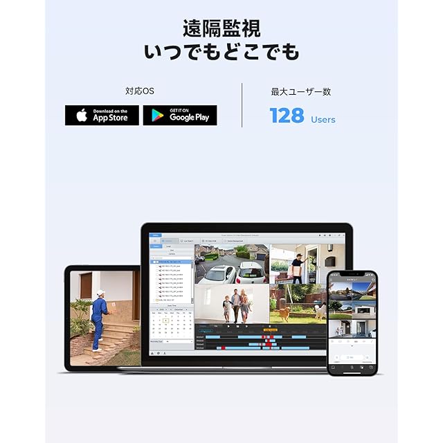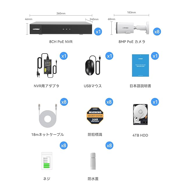 【遠隔監視対応&8CH 4K NVRレコーダー対応/8台増設可能】①遠隔監視対応:スマホとPCでアプリ、またはソフトをダウンロードします。 Iphone/Android/Windows PCによって、いつでもどこでもリ遠隔監視できます。もちろん、遠隔再生することもできます。外出中でも、録画モード設定や録画再生、バックアップすることもできてとても便利です。②8CH 4K NVRレコーダー対応/8台増設可能:4K録画機は8CH付いていますので、H.VIEWの全て3MP 4MP 5MP 8MPカメラは8台増設可能です。1台のパソコンでリアルタイムの映像を複数所分1つの画面で見れます。