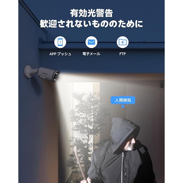 【AI検知/人体検出点灯機能&H.265録画保存&4TB HDD付き】①現在このPOEカメラはAI検知機能(人間モーション検知とケーブル検知と侵入検知)を備えています。不審者が入ったら、カメラは至急検知して、スマホでアラームに送信されます。スナップショッはFTPアップロードを対応可能し、自動的に写真や録画をアップロードすることを設定できます。夜に人体を検出した場合は、白色光ライトが点灯できます。②H.265録画保存:常時録画とスケジュール録画と動体検知録画を設定できます。H.265動画形式を採用し、H.264より約50%のストレージ容量を大幅に節約可能できます。 低ブロードバンドても高画質を見ることができます。③本製品は4TB HDD付きで連続的に録画できますが、まだ上書き機能付きで容量がいっぱいになると、カメラは自動的に前の内容を削除されます。つまり365日ループ録画できるということです。