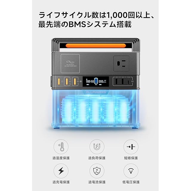★【ライフサイクル数は1,000回以上、最先端のBMSシステム搭載】高品質のリチウムイオン電池を採用して、バッテリー保護に工夫したALLPOWERS S300 PLUSのライフサイクル数は1,000回以上となります。高精度なBMS(バッテリーマネジメントシステム)を搭載することより、過充電保護、過負荷保護、過電流保護、低電圧保護、高温保護、短絡保護など保護機能が付きます。それに、数多くの国際認証を取得しており、高い信頼性と耐久性が証明されています。