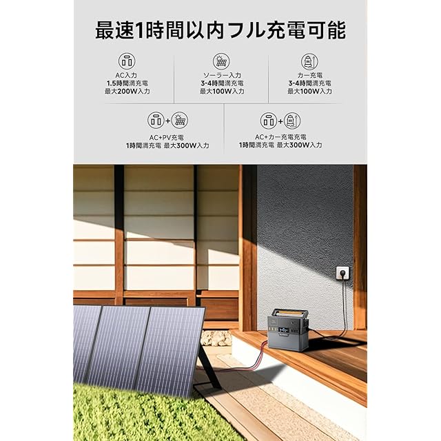 ★【4つの充電方法、1時間フル充電】ALLPOWERS S300 PLUSポータブル電源には4つの充電方法があります。①AC入力(最大200W);②PV入力(MPPT最大電力追跡機能搭載 最大100W);③カー充電(最大100W)④デュアル充電:①+②/③のデュアル充電(最大300W)で1時間内にフル充電可能!