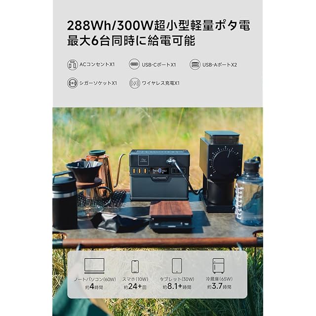 ★【288Wh大容量、合計6台同時に給電】ALLPOWERS S300 PLUS ポータブル電源は288Wh/78000mAh大容量のリチウム蓄電池が装備され、最大出力300W(サージ600W)の純正弦波AC出力*1や100W急速充電のUSB-Cポート*1、2つのUSB-Aポート(5-6V 3A,6-9V 2A,12V 1.5A,最大18W)、シガーソケット(12V/10A)、ワイヤレス充電器(5V/1A)を搭載。スマホ、タブレット、ドローン、懐中電灯、ノートパソコン、デジタルカメラ、サキュレーター、Nintendo Switch、液晶テレビ、プロジェクト、車載冷蔵庫、小型扇風機など全部給電可能で、この1台があれば、どこでもキャンプ/ワーケーションができます。また、本体にLEDライトが装備され、災害などの緊急時の照明、給電にも非常用電源、停電バックアップ電源としては大変役に立ています。