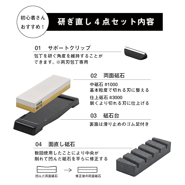 これ一つで匠の切れ味を永遠に、研ぎ直しコンプリートセット!包丁のメンテナンス方法が分からない・・・どんな砥石や道具を揃えて買ったらいいか分からない・・・そんな方に是非おすすめの4点セットです。