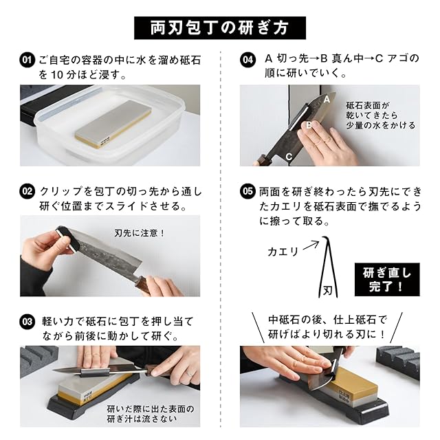 サポートクリップ:研ぐ際に重要な「包丁を寝かせて研ぐ角度」を維持することができます。※両刃包丁専用