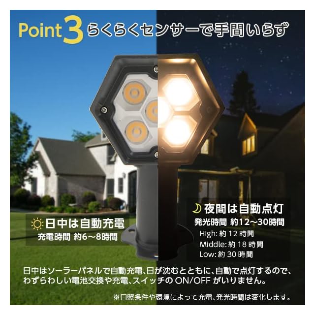 【最大30時間点灯】大きなソーラーパネルと3,600mAhのバッテリーを搭載し、バッテリーがフル充電の状態であれば長時間点灯が可能です。