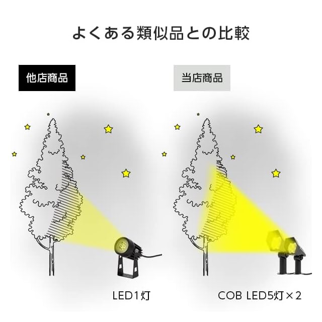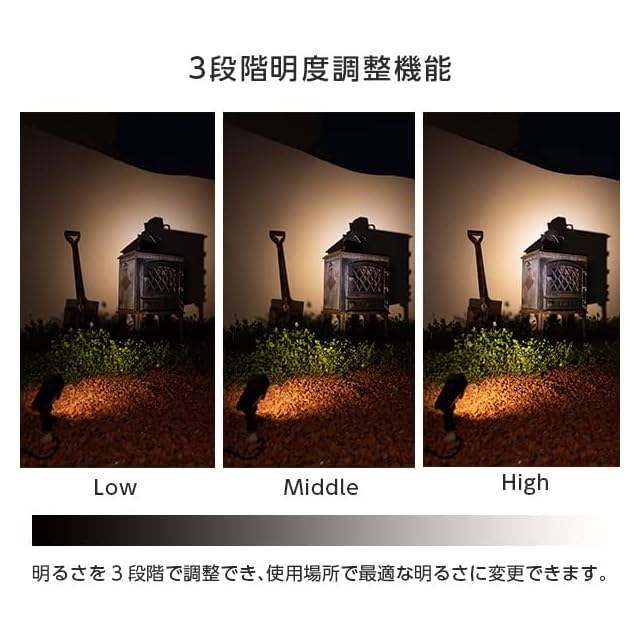 【最大300ルーメン】優しい暖色系の高輝度をLEDを5灯搭載し壁やシンボルツリー、地面をしっかり明るく照らします。また3段階の調光機能で明るさを調節可能。