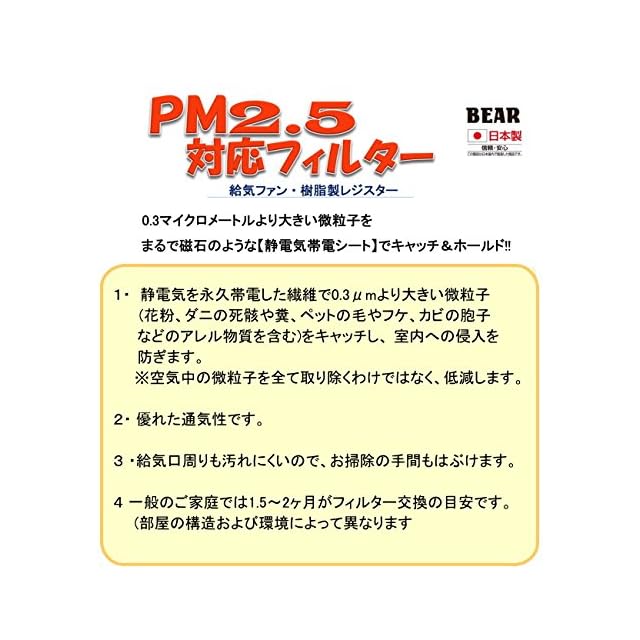 1 静電気を永久帯電した繊維で0.3μmより大きい微粒子(花粉、ダニの死骸や糞、ペットの毛やフケ、カビの胞子などのアレル物質を含む)をキャッチし、 室内への侵入を防ぎます。 ※空気中の微粒子を全て取り除くわけではなく、低減します。 2 優れた通気性です。 3 給気口周りも汚れにくいので、お掃除の手間もはぶけます。 4 一般のご家庭では1.5~2ヶ月がフィルター交換の目安です。 (部屋の構造および環境によって異なります)