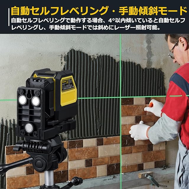 ✅「自動セルフレベリング・手動傾斜モードに」磁気制動方式のレーサー墨出し器ですが、レーザーラインを固定することができ、多用途にも使えます。本体を傾けても自動制御せずにそのままレーザーラインを射出します。レーザー安全基準:クラス2 出力:1mW以下