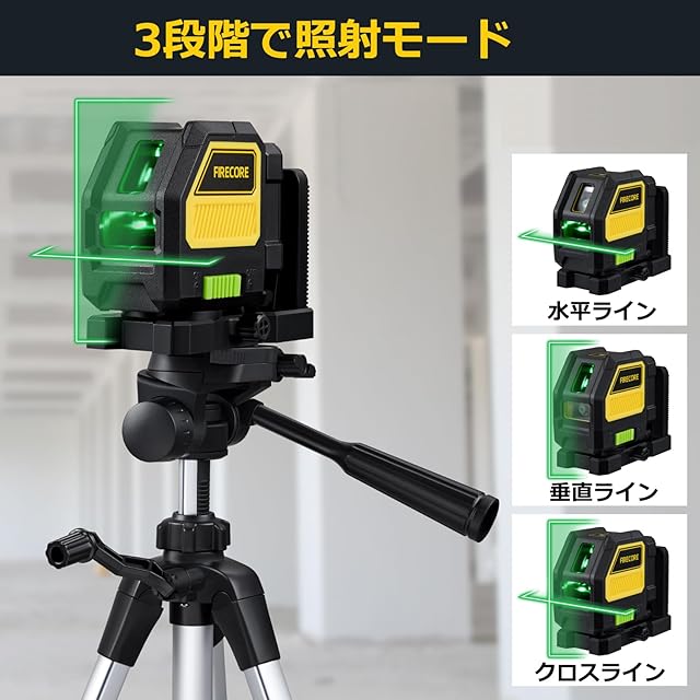Firecore レーザー墨出し器 グリーンレーザー クロスライン 水平器 高輝度 墨出し セルフレベリング 360°壁掛け強力マグネットホルダー付き 乾電池式 小型 屋外 墨出し器 レーザー レベル レーザー測定器(F114G)【電池残量表示仕様・受光器セット付き】