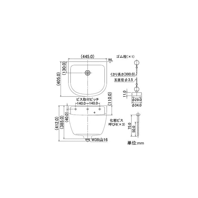 仕様:ゴム栓付き(くさり付)、オーバーフローあり