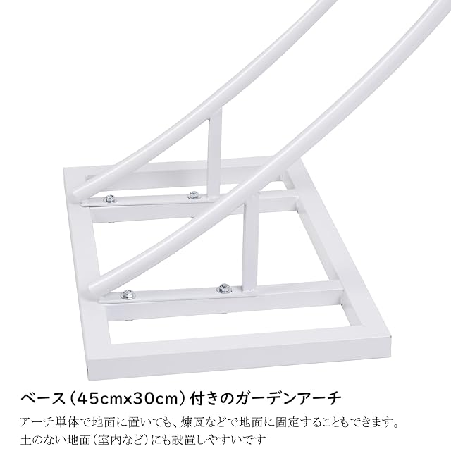 【土台付き・屋内外にも設置しやすい】ベース(土台)付きのガーデンアーチで、アーチ単体で地面に置いても、煉瓦などで地面に固定することもできます。土のない地面(室内など)にも設置しやすいです