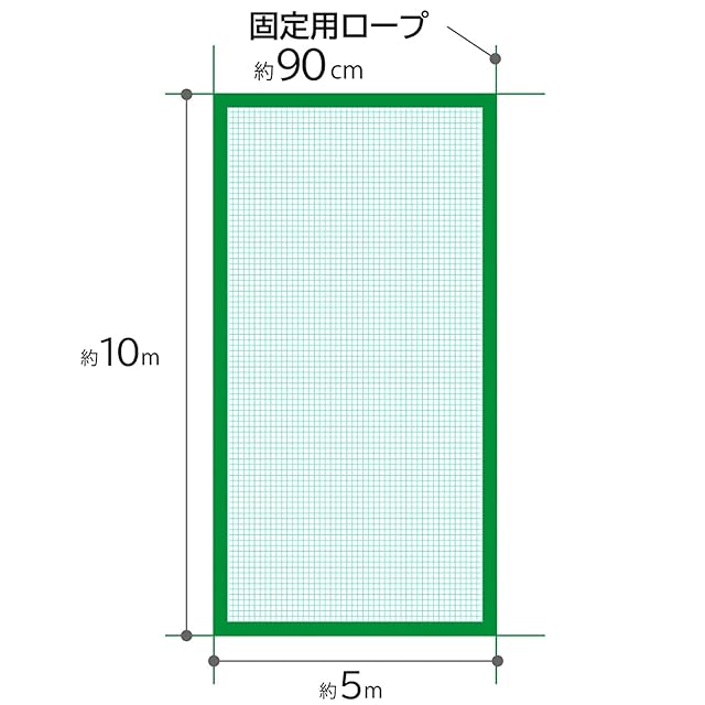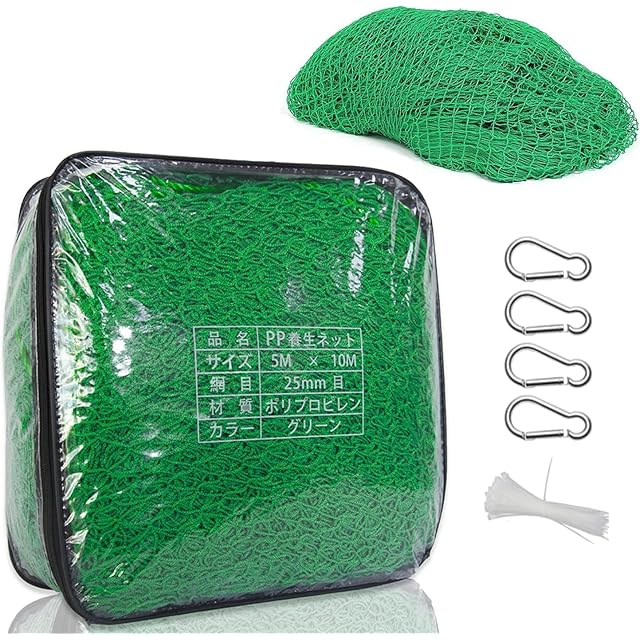 【商品仕様】:グリーンネットのサイズ: 幅約5m×奥行10m 網目サイズ: 約2.5×2.5cm 紐の長さ: 約90cm カラー: グリーン 内容: 1枚 材質: ポリプロピレン