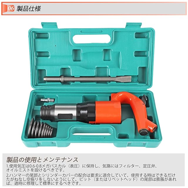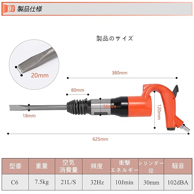 【仕様】型番:C6|材質:高硬度合金|衝撃エネルギー:10J/min|空気消費量:21L/S min|頻度:32Hz/min|シリンダー径:30mm|空気圧コネクタ外径:13mm|重量:6.6kg