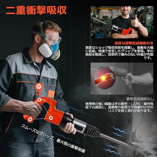 【振動低減設計】人間工学に基づいたハンドルが衝撃を吸収し、手や腕の疲労を大幅に軽減。自動車整備や金属加工など、長時間の作業でもスムーズな操作性を維持します。
