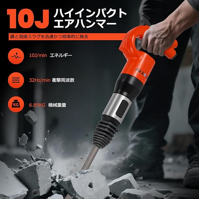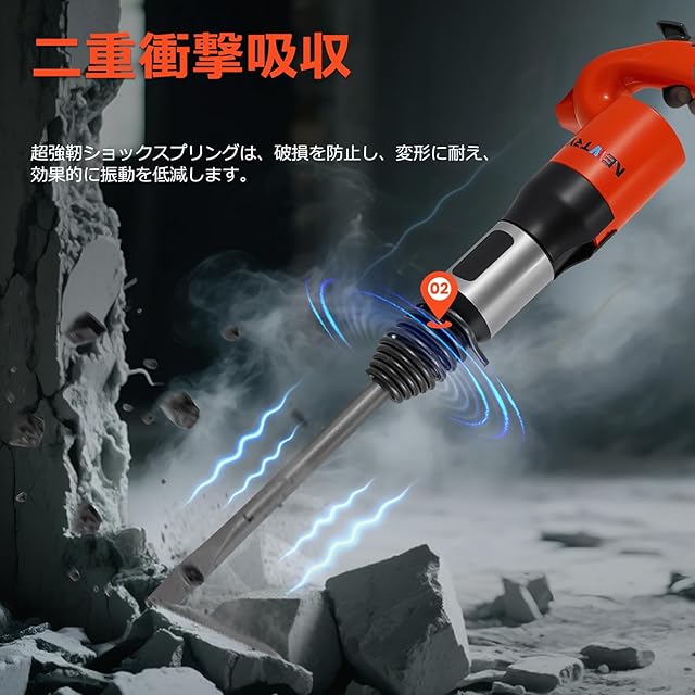 NEWTRY エアーハンマー 減震 空気圧ハンマー プロ仕様 高衝撃力 耐摩耗性 サビ取り 溶渣バリ除去 石材 コンクリート破砕 壁面掘削 フラットチゼル 専用ケース付き 工業用 ハツリ工事 工場・建設現場用 (C6)