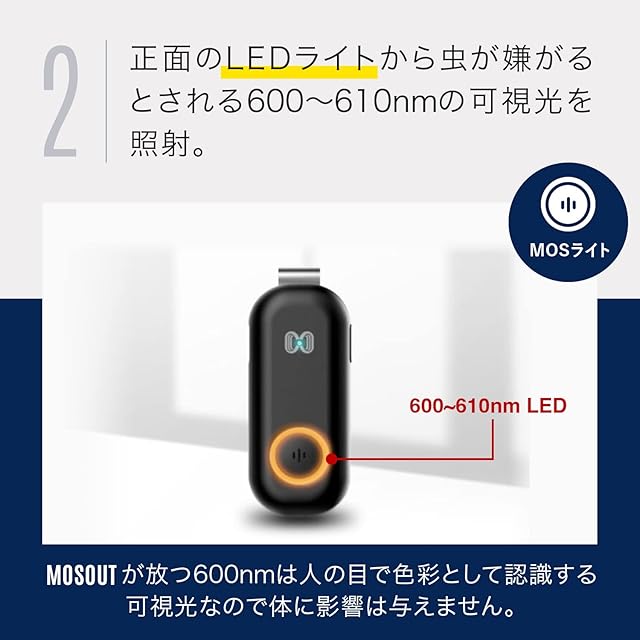 【虫が嫌がる光を照射】正面に搭載したLEDライトから、虫が嫌がるとされる600~610nm(ナノメートル)の可視光を照射。MOSOUTが放つ600nmは人の目で色彩として認識する可視光なので体に影響は与えません。