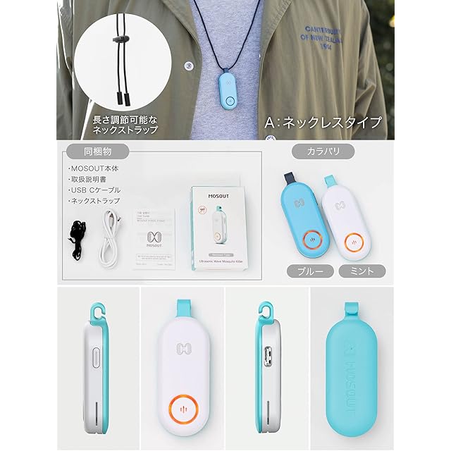 MOSOUT サイズ22×56.6×11mm 素材ABS・メタル 重量11g 虫除け 虫対策 蚊除け 蚊対策 蚊忌避 虫対策 無毒 アウトドア山登り 釣り 公園 子供/大人兼用 超音波 光の波長 (ミント(ネックレス))