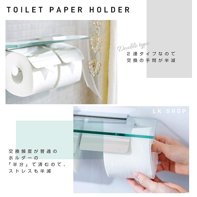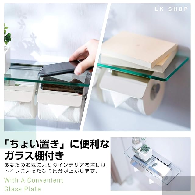 LK SHOP トイレットペーパーホルダー ガラス棚 2連タイプ ペーパーホルダー 棚付き