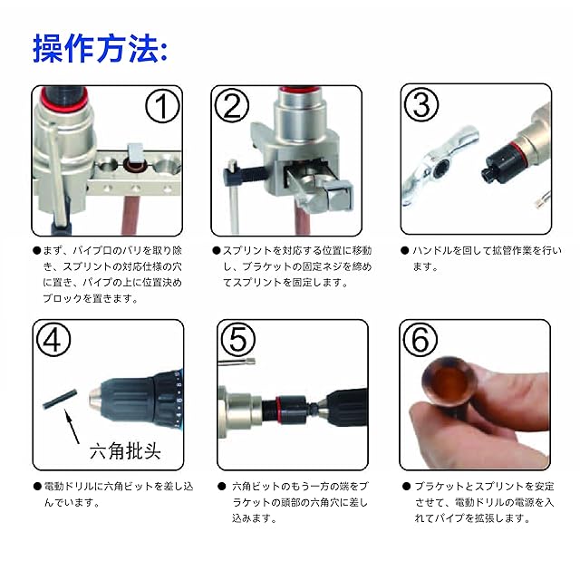 【セット内容】本体X1、ミリメートル制の拡張クランプX1、インチ制の拡張クランプX1、パイプカッターX1、面取りX1。