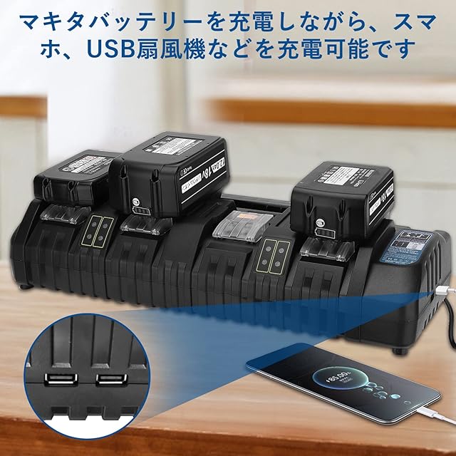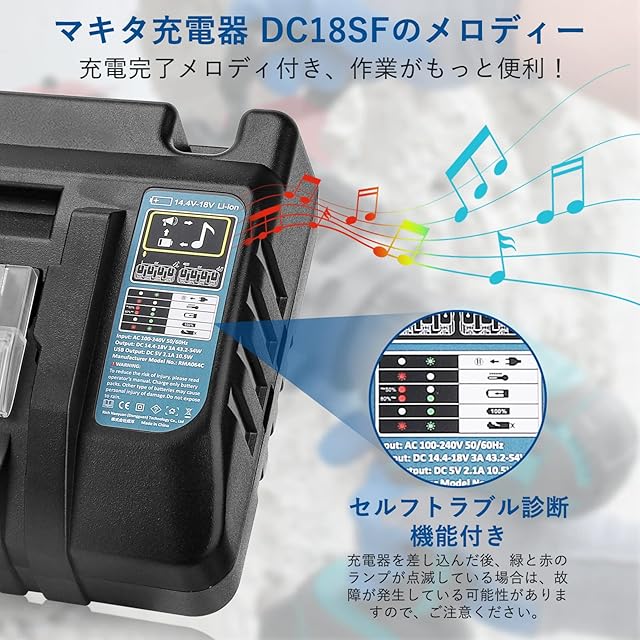 Enermall 互換 マキタ 充電器 DC18SF マキタ 14.4v-18v 4口充電器 4本同時充電可能 USBポート メロディ付 互換 キタリチウムイオンバッテリー用 BL1415N BL1420 BL1430 BL1440 BL1450 BL1460B BL1815N BL1820 BL1830 BL1840 BL1850 BL1860Bなどに対応可能