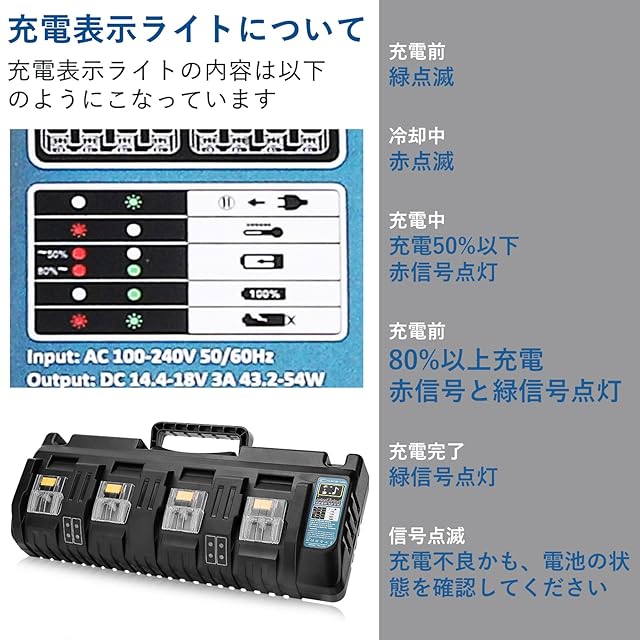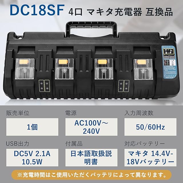【 互換 マキタ充電器 DC18SF 】型番: DC18SF 4口充電器 入電圧:100ー260V 入力周波数:50ー60Hz 出力電圧:直流14.4v-18v 出力電流:3A 4台のバッテリーを同時に充電可能。