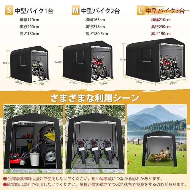 【商品仕様】商品Lサイズ:幅250奥行210高さ190cm、自転車最大4台収納可能。バイク最大3台収納可能。庭や軒先、畑や田んぼなど様々な場所でお使い頂けます。商品に4つの重石カバーと日本語取扱説明書があり、予めご了承ください。