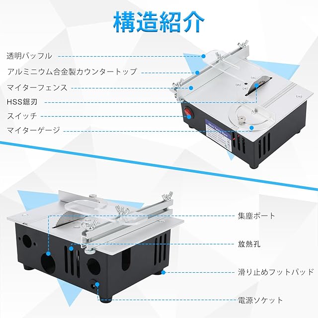 【安全設計と耐久性】一体型のアルミ合金ボディで作られたこのミニテーブルソーは、優れた耐久性と長期安定性を備えています。このソーには透明安全カバーが装備されており、操作中に破片やほこりからユーザーを保護し、全体的な安全性を高めます。
