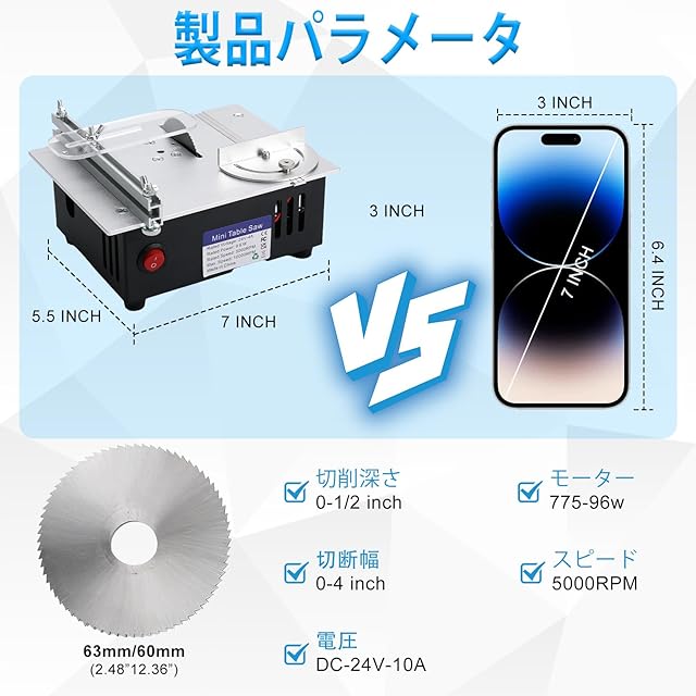 LEZZYRUCK 24V 電動小型テーブルソー ミニチュア電動のこぎり 5000Rpm 7段速度調節 0.1-15mm切削高さ調整 木材/プラスチック/アルミ板切断用 鋸刃4枚付き DIY精密加工機 家用 14*18*8cm ホワイト