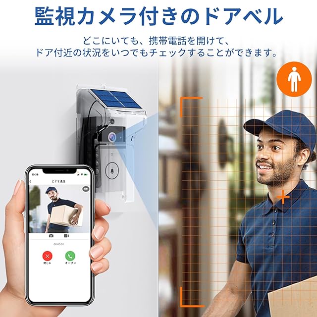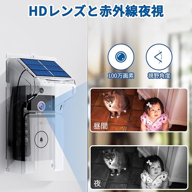【USB電源充電&ソーラー充電】他の玄関チャイムと比べて、このドアホンは2種類の充電方式があります。3600mAhの大容量バッテリーを内蔵し、USB充電方式で2-3時間を経って充電完了です。定期的な充電を覚えておく必要があります。同時にソーラー充電を補助し、太陽光を自動的に吸収して電気エネルギーに変換し、電気量を増加させることもあります。(ご注意:本製品は完全にソーラー充電機能を使用して電力量を保持することはできません。USB電源充電で電源供給が主要な方式であり、ソーラー充電は補助的な充電手段にすぎません。)