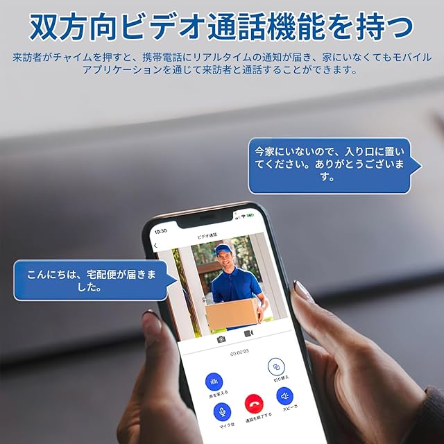 【通話機能持つ】誰かがチャイムを押すと、チャイムをバインドした携帯電話にアプリからメッセージが届き、来訪者とビデオ通話ができます。さらに、変音対応可能でプライバシーを保護します。