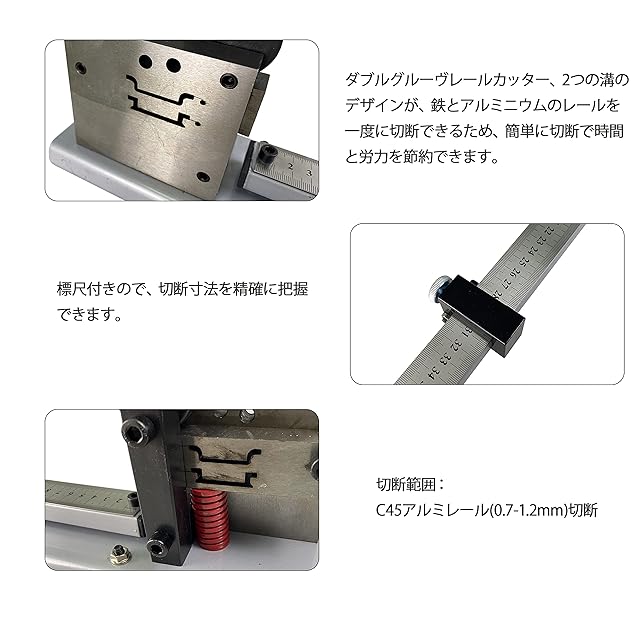 【デザイン】ダブルグルーヴレールカッター、2つの溝のデザインが、鉄とアルミニウムのレールを一度に切断できるため、簡単に切断で時間と労力を節約できます。標尺付きので、切断寸法を精確に把握できます。