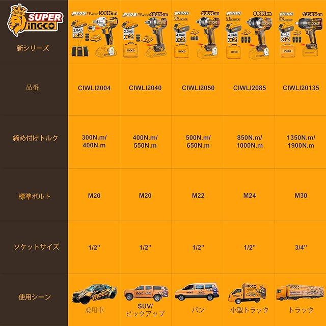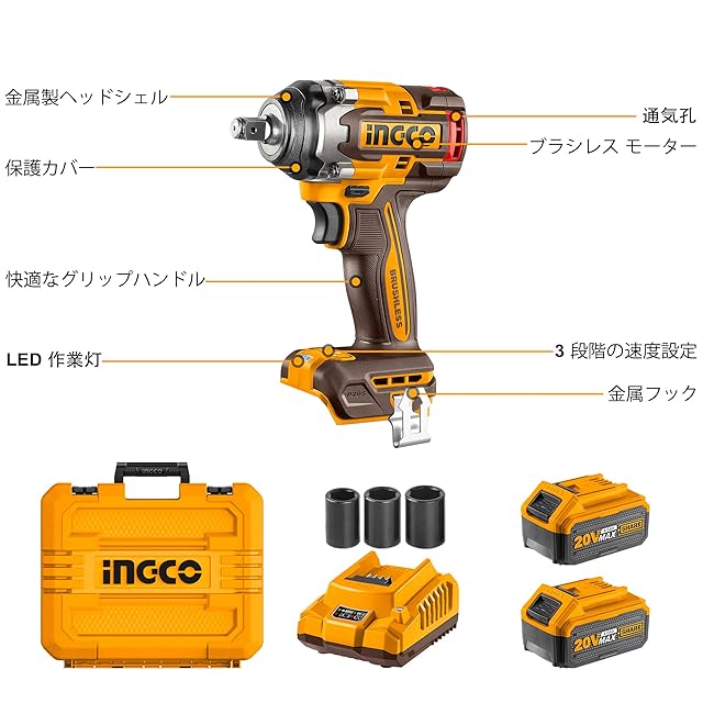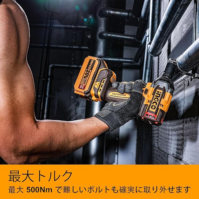 INGCO 20V ブラシレスインパクトレンチ 500Nm コードレス 1/2インチ 電動インパクトガン 2200RPM 2個の4.0Ahバッテリーと1個の急速充電器付き CIWLI2050