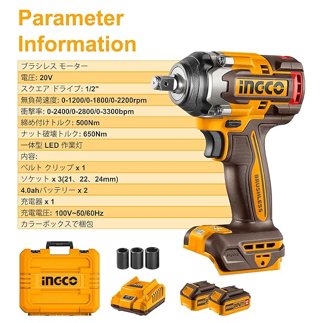 セット内容: コードレスインパクトレンチ x 1、4.0ah バッテリー x 2、充電器 x 1、ベルトクリップ x 1、ソケット (21/22/24mm) x 3、キャリングケース x 1