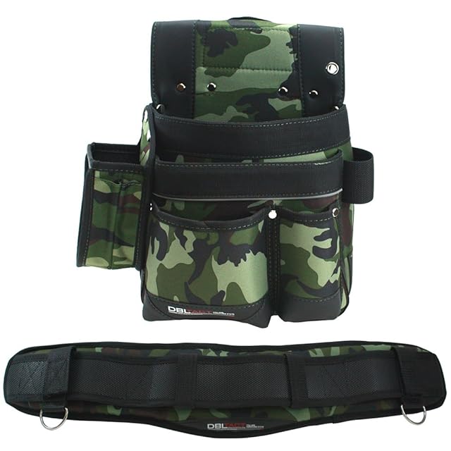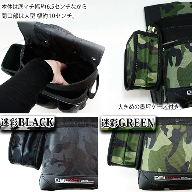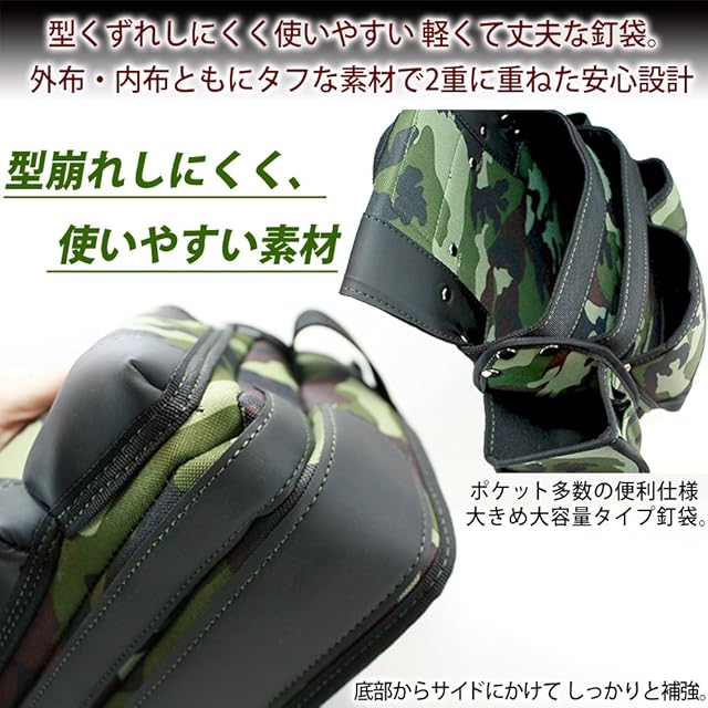 タフ設計の使い心地と安心感。外布・内布、表裏からタフ素材を2重使いした釘袋は軽くて丈夫!かたくずれしにくく使いやすいです。墨坪ケース付き。透かし風の大人の迷彩ブラックと迷彩の定番グリーンの2種類です。