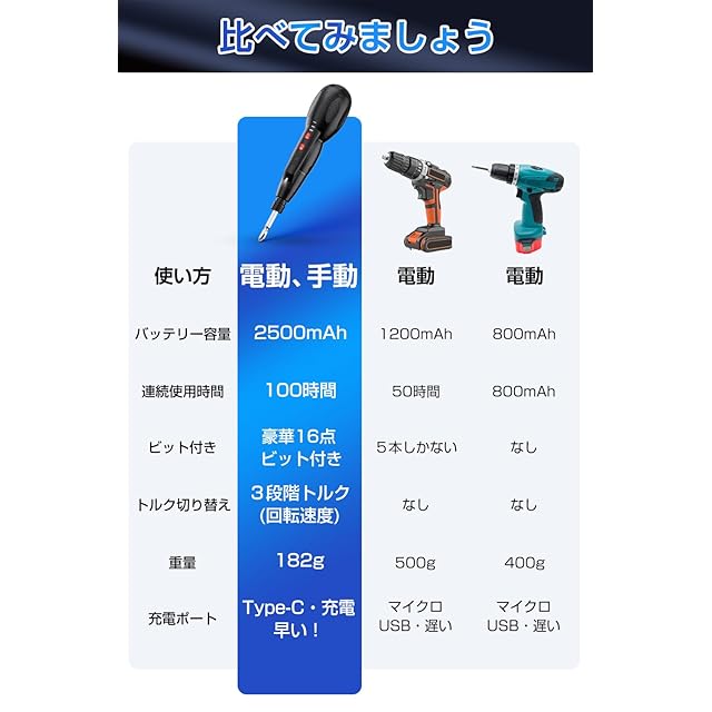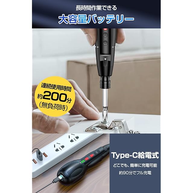 【長時間使える2500mAh大容量バッテリー】一般的な 電動 ドライバー と比べて、バッテリー容量は2倍以上の2500mAh。1回のフル充電で最大約100時間使用可能。突然の故障修理や、週末のDIY作業などでも安心。 USB Type-C 充電ポートを採用しており、スマホの充電器でそのまま使えるのも便利ポイントです。