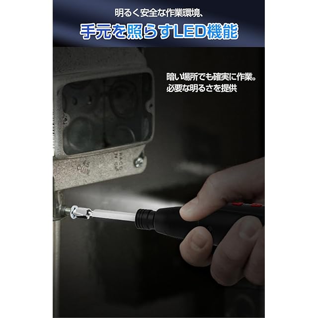 【LEDライト&磁石付きで夜間作業も安心】先端には 高輝度 LEDライト が内蔵されており、暗い場所でも作業OK。テレビ裏や収納棚の奥など、光が届きにくい場所でも大丈夫。さらに先端はマグネット付きなので、ネジを落とさずに片手で固定しやすい設計。小回りの利く一台として、家庭用ツールボックスに常備しておくと重宝します。