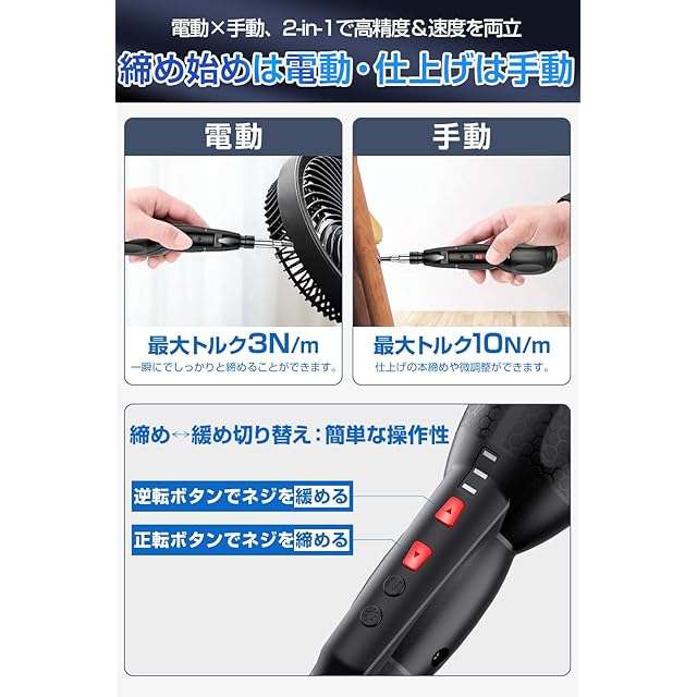 【初心者でも扱いやすい!電動&手動両用タイプ】この 電動ドライバー 小型 モデルは、 電動 と 手動 の2WAY仕様。ボタンひとつで 正逆転切り替え も可能なので、ネジ締めやネジ外しが簡単にできます。 電動 ドライバー 初心者の方でも迷わず使える シンプル 設計。家具の組み立てや、自転車の部品調整など、日常のちょっとした作業にも大活躍します。