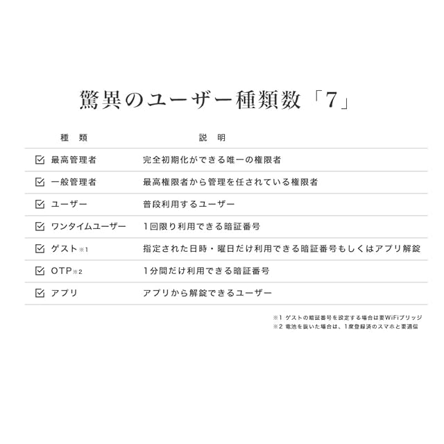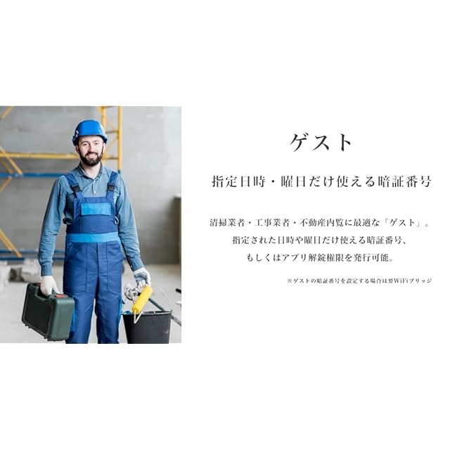 解錠方法:アプリ/暗証番号/FeliCa(R)/MIFARE(R)/スマホNFC/指紋/リモコン(別売)/a接点(別売)/交通系ICカード/おサイフケータイ